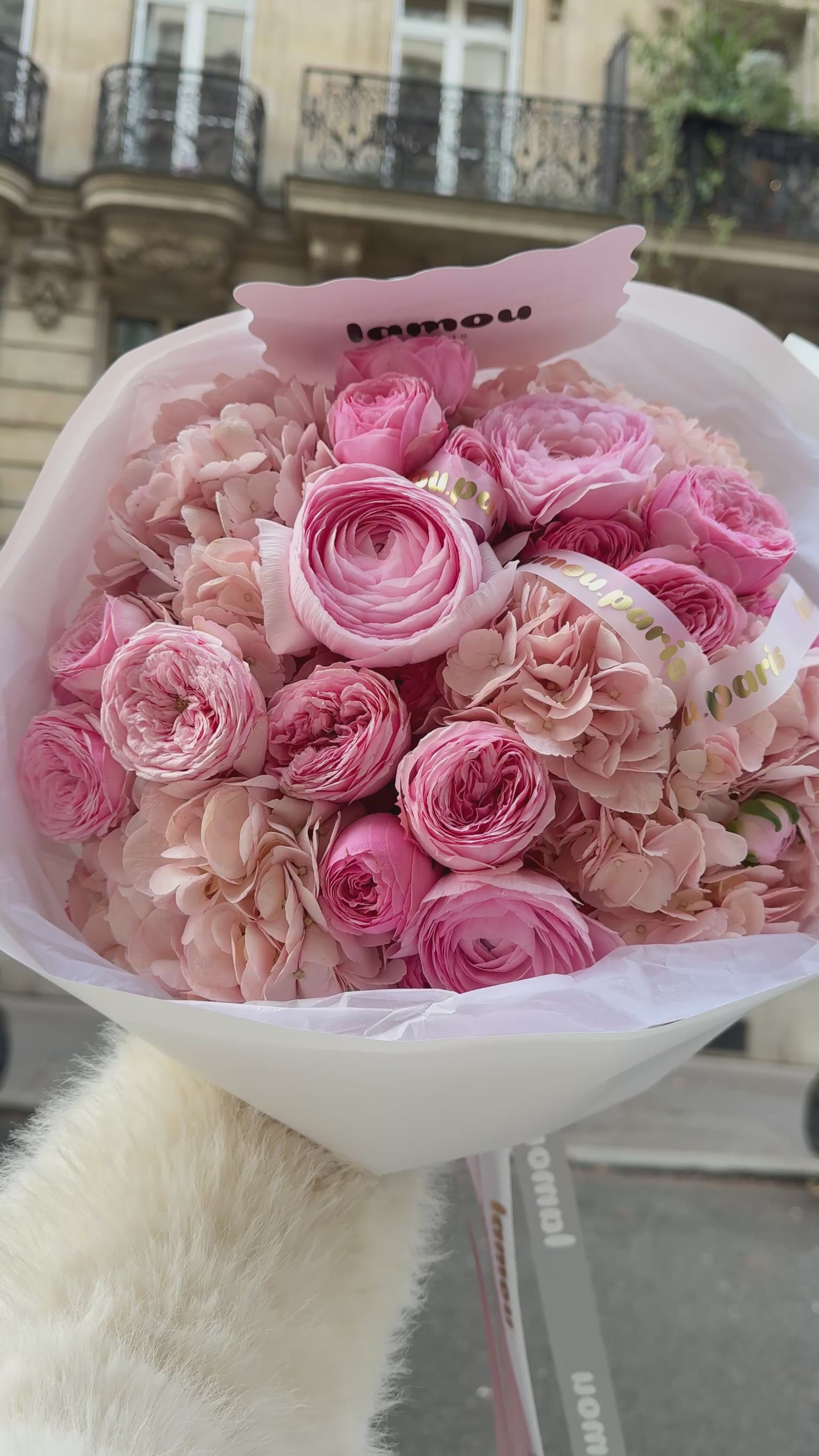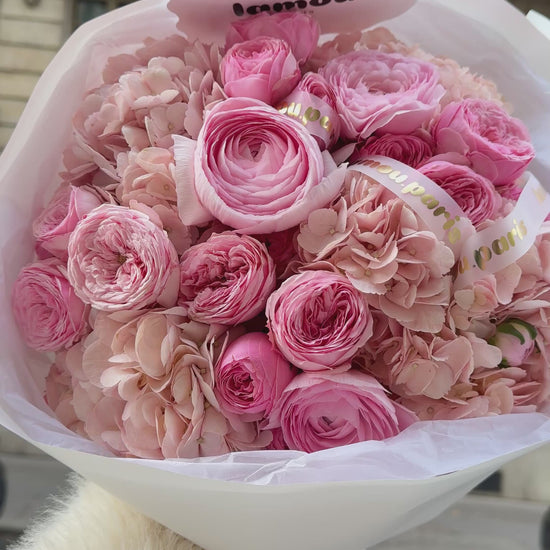 Hortensias rose poudré, roses pivoines, renoncules (ou pivoines).