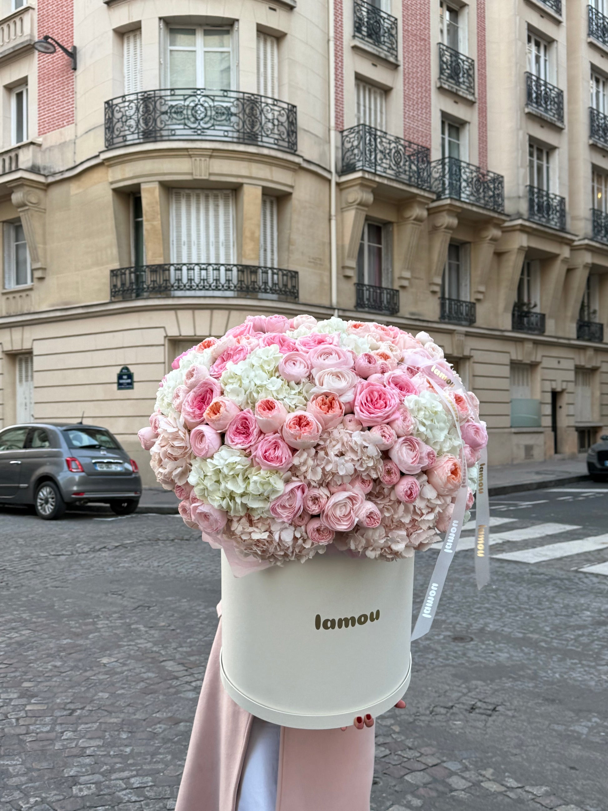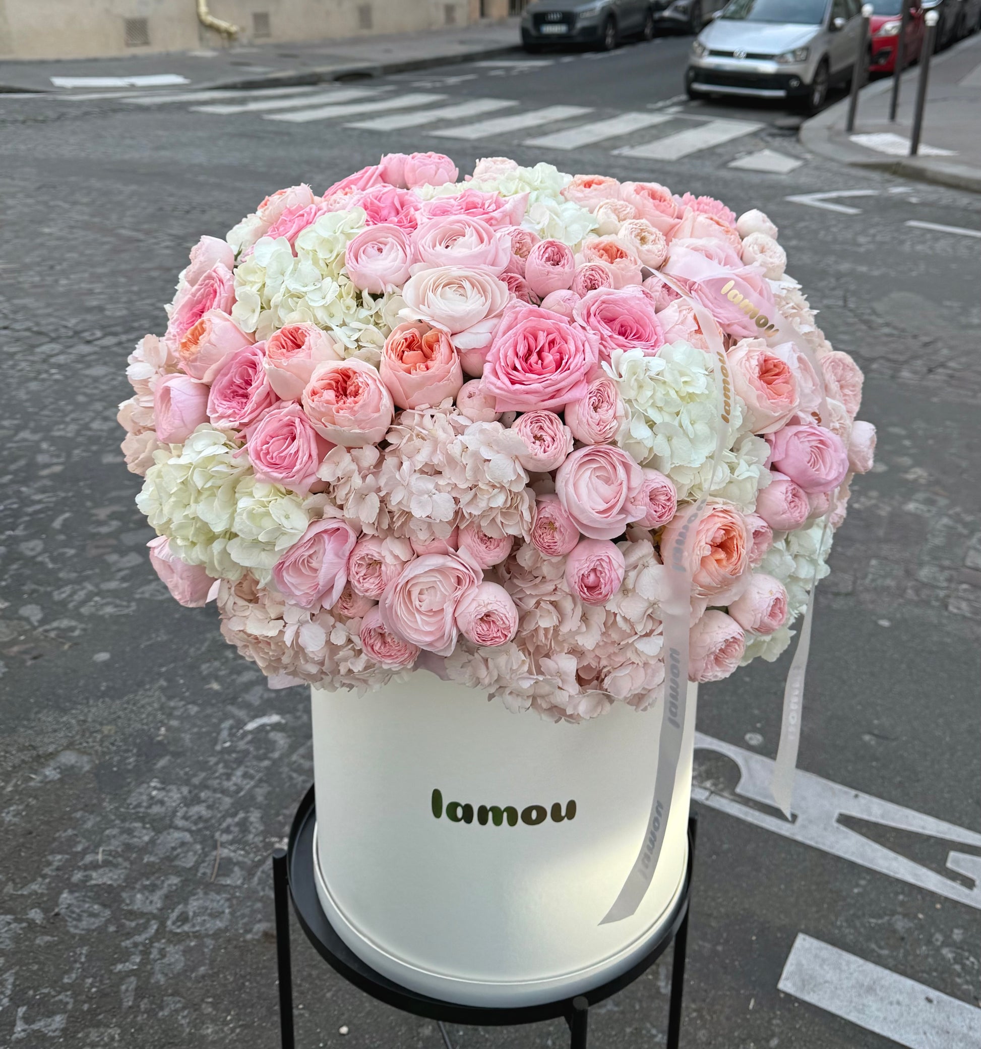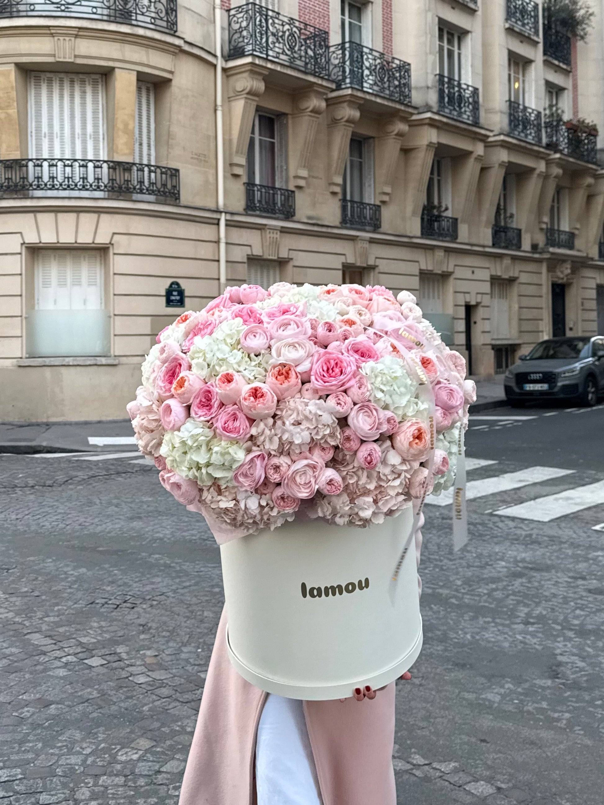 Hortensias, rosiers « David Austin », rosiers O'Hara, pivoines. Boîte XL en velours beige.