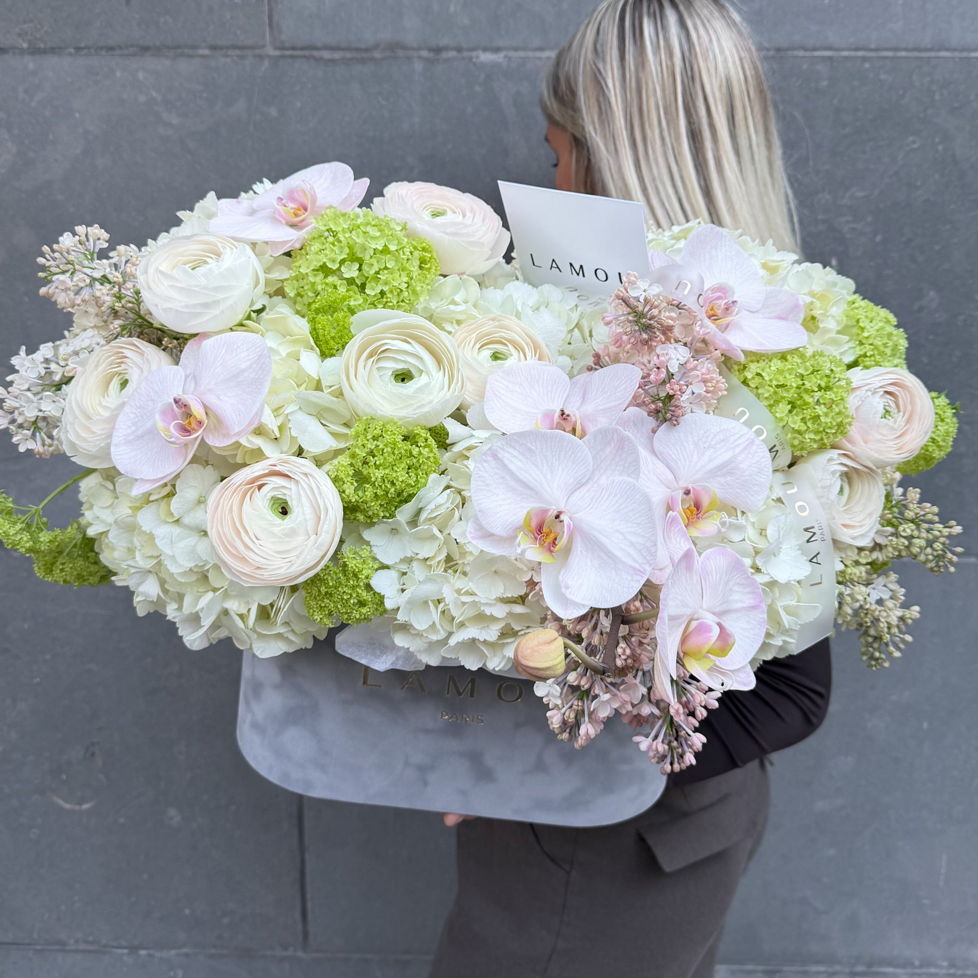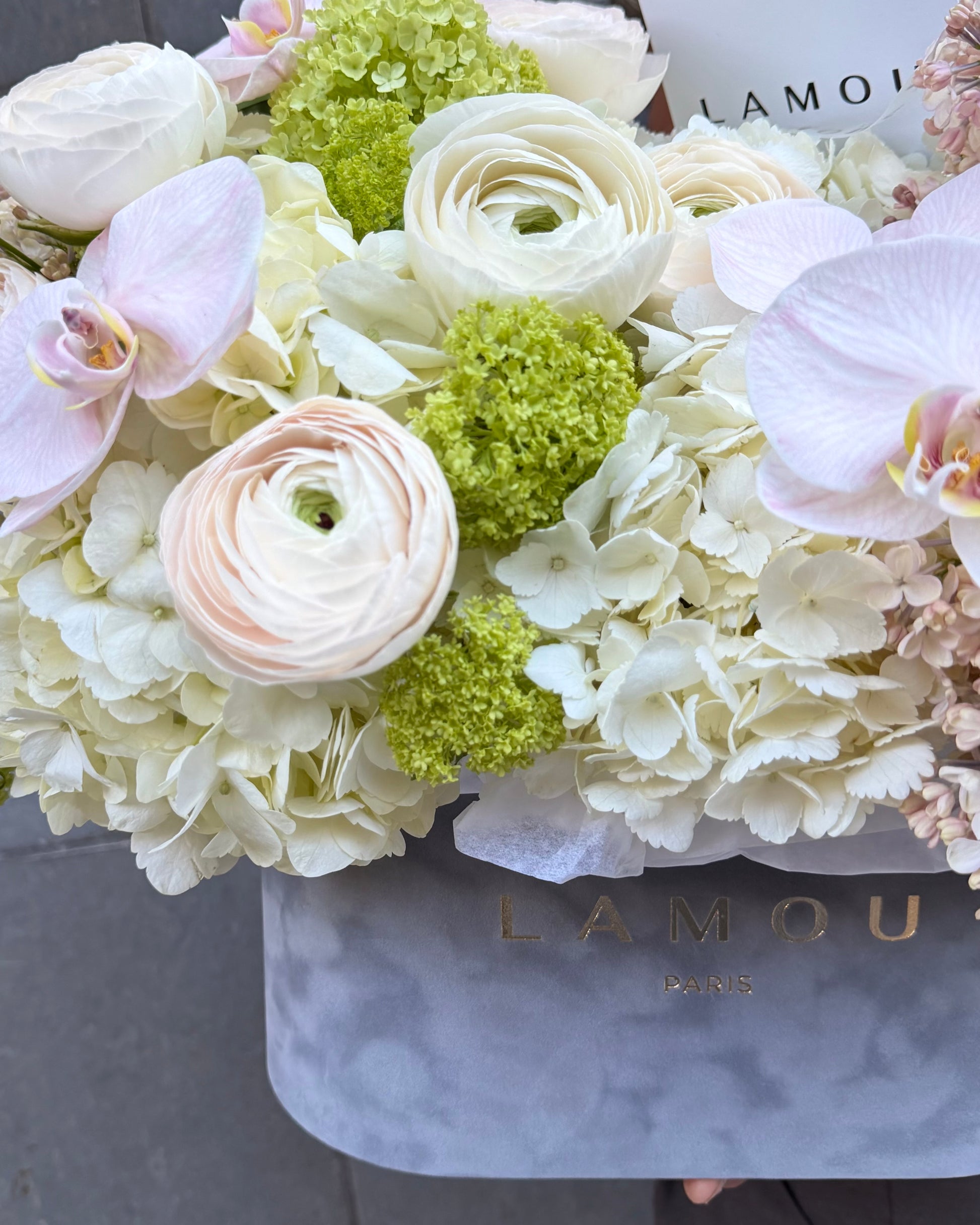 Hortensias, renoncules d'Hanoi, orchidées roses, lilas et viornes — une palette délicate de blancs, de verts et de roses tendres qui évoque un jardin en début de floraison.