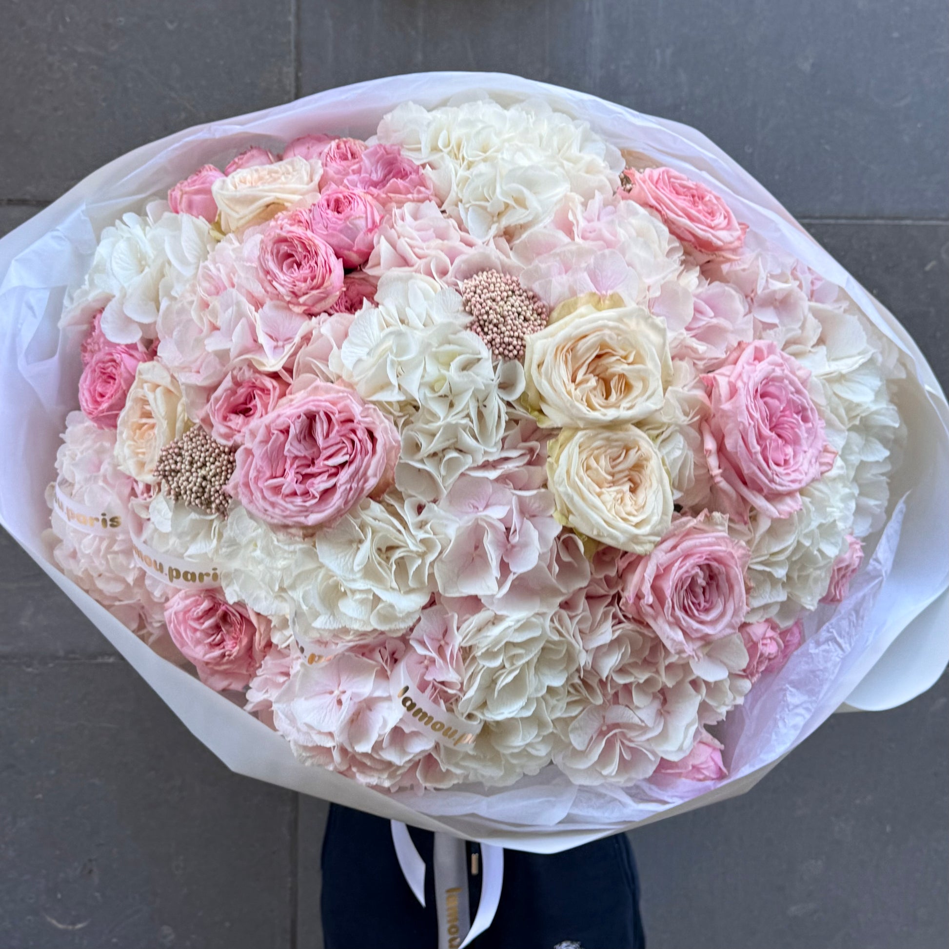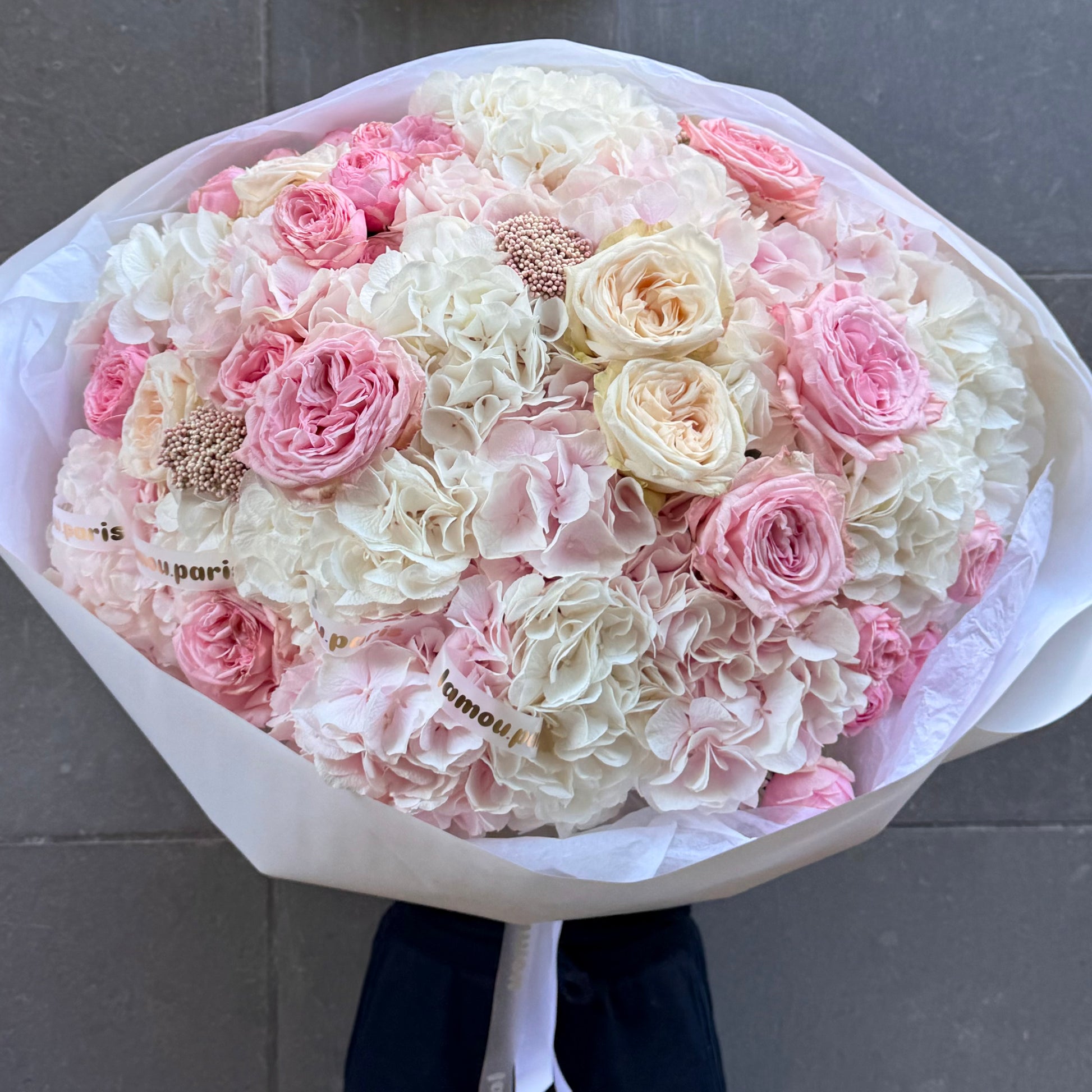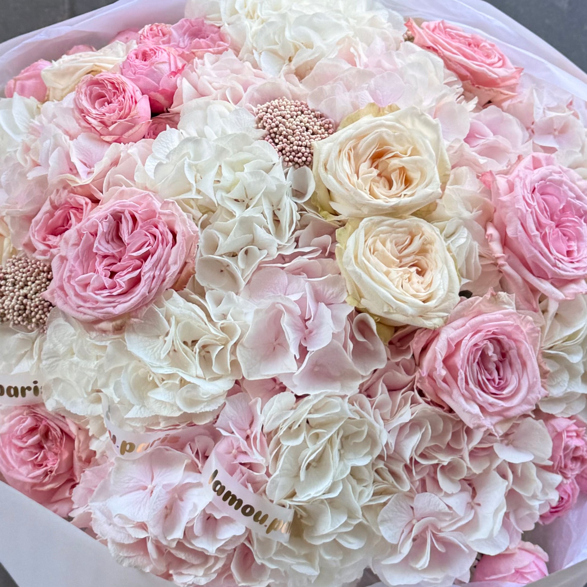 Hortensias blancs, hortensias roses, roses pivoines roses de qualité supérieure, rosiers en spray, fleurs d'accent