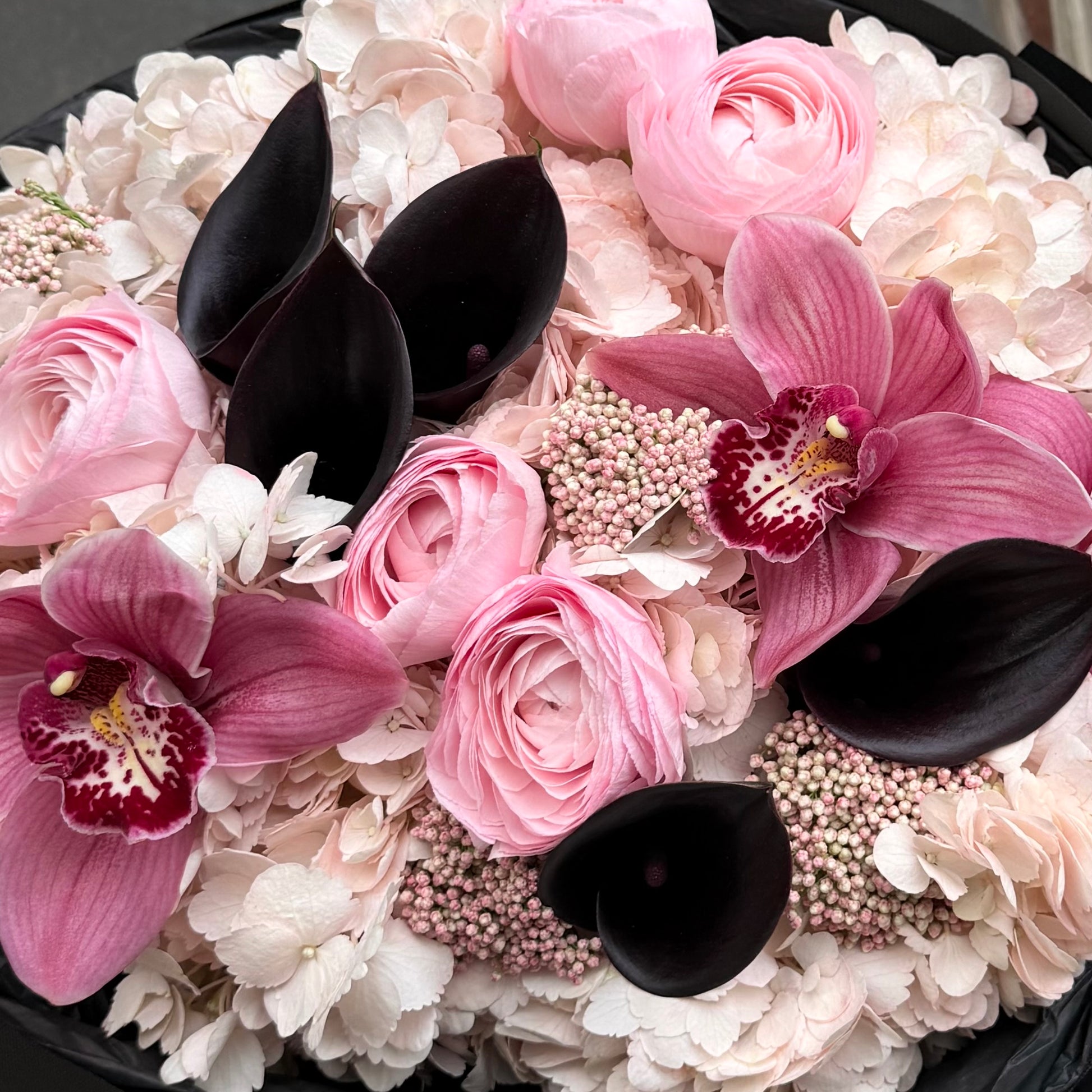 Dark and dramatic. Hydrangeas, pink cymbidium, ranunculus lady, and dark calla lillies — contrasting soft femininity with bold, almost noir undertones. A bouquet for someone with unapologetic taste.