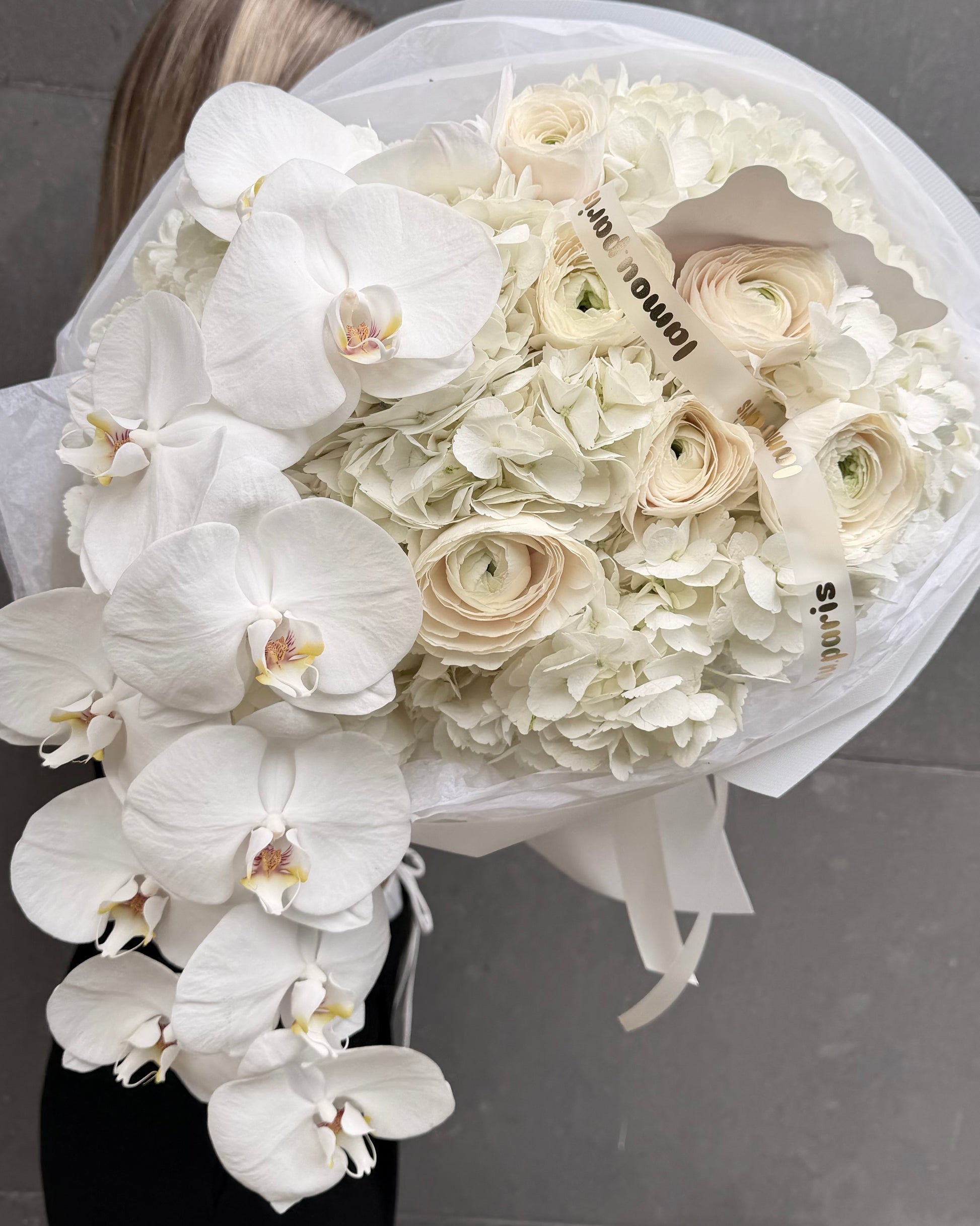 White hydrangeas, white perfumed peony roses (or ranunculuses hanoi) and orchids — an all-white composition with depth and texture. Elegant without trying, the kind of bouquet that elevates any room it enters.
