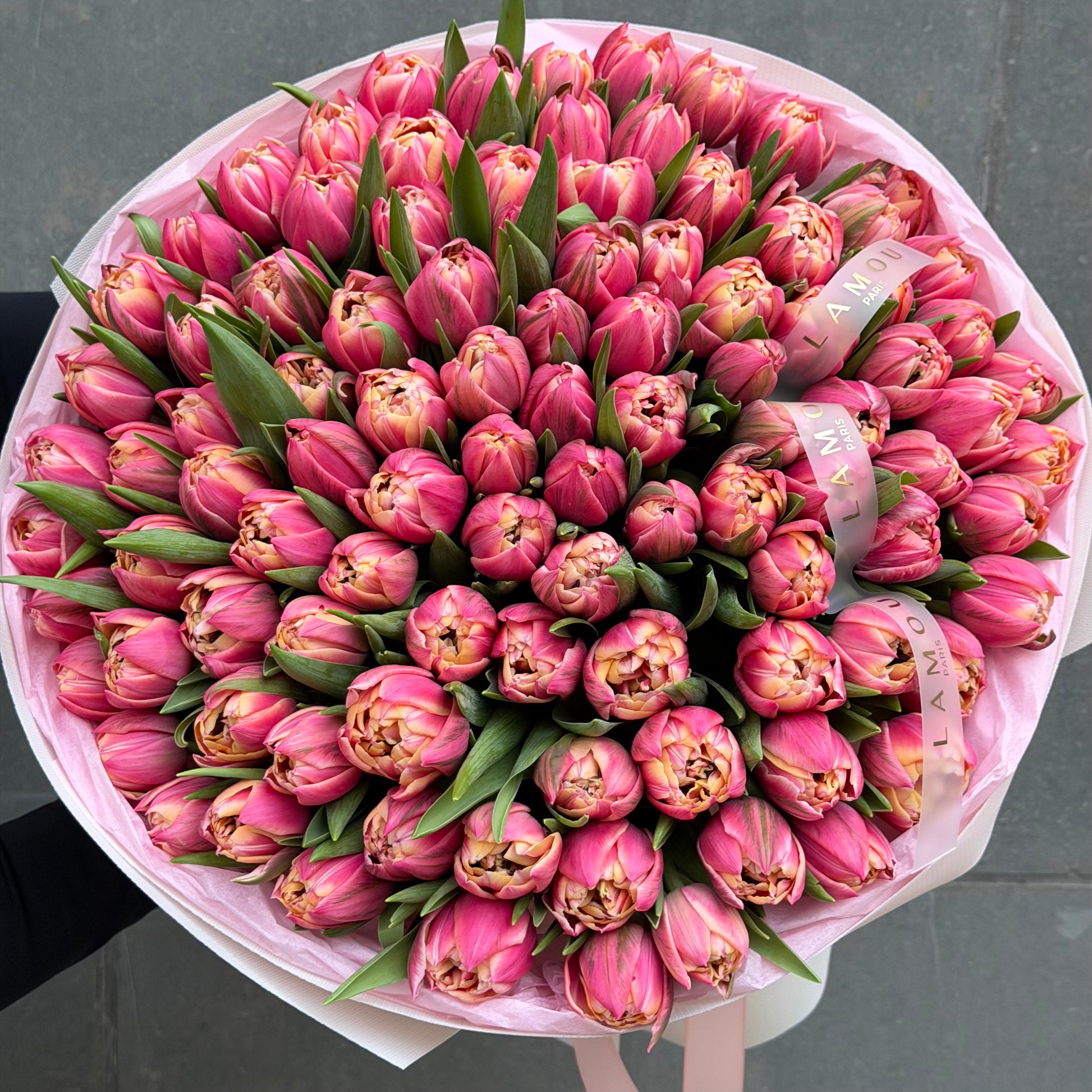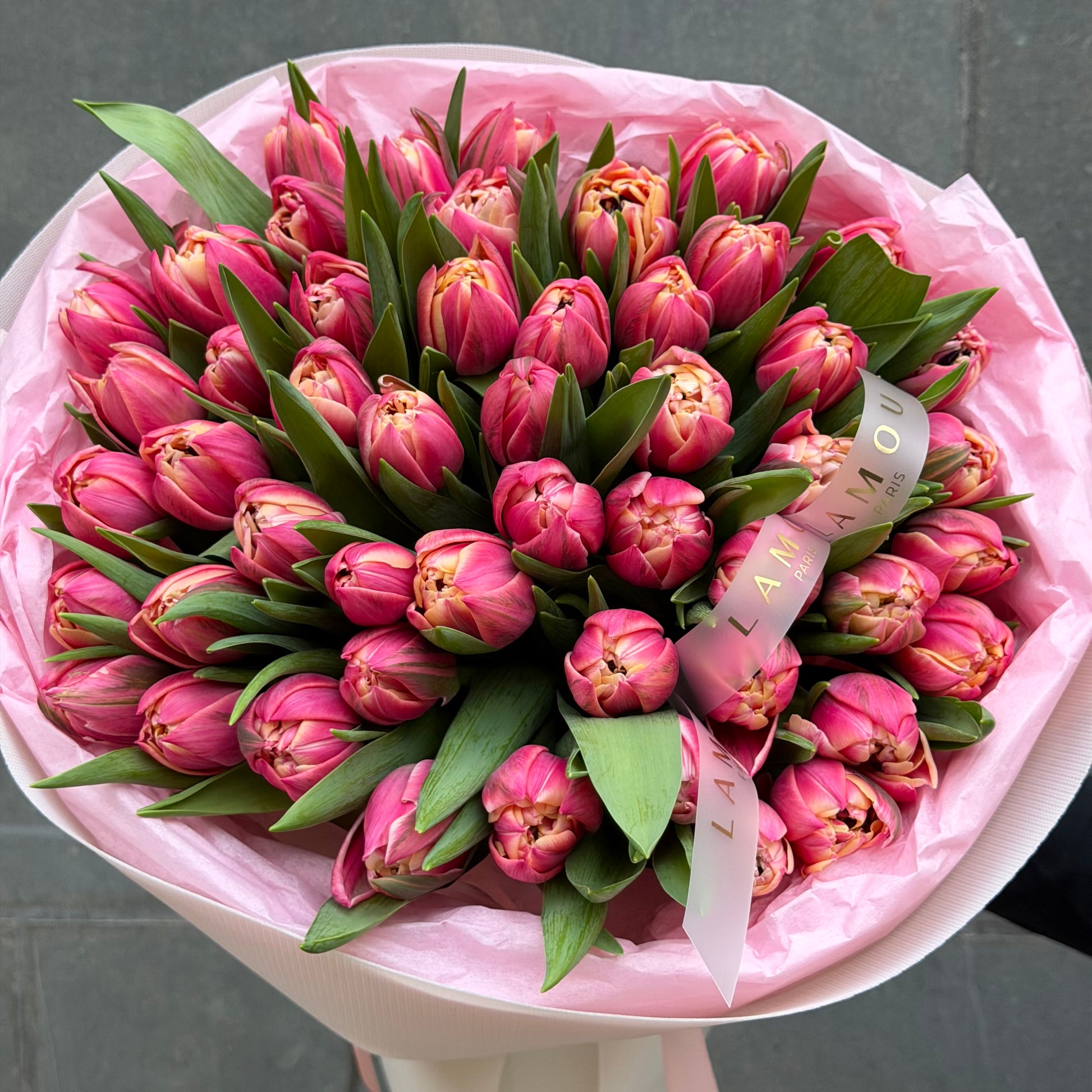 Celebrate every special moment with a breathtaking bouquet of Columbus tulips — a Double Early variety beloved for its lush, peony-shaped blooms in a striking blend of rosy pink and creamy white. With their thick, layered petals and rich, voluminous form, Columbus tulips offer something truly beyond the ordinary, turning any bouquet into a statement of pure luxury.