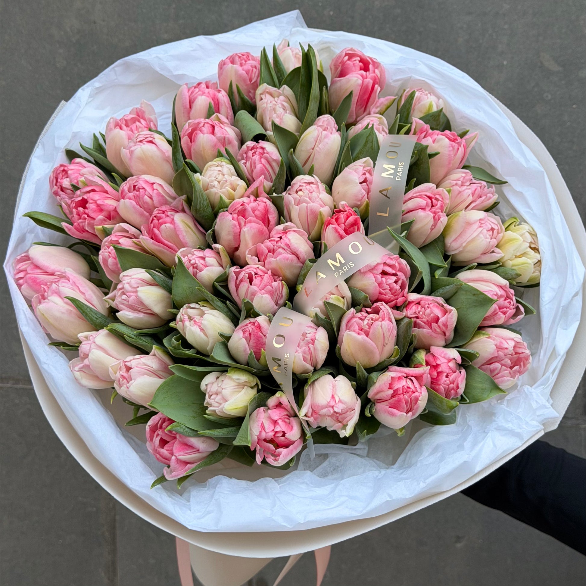 Celebrate every special moment with a breathtaking bouquet of Foxtrot tulips — a Double Early variety adored for its large, fully double, bowl-shaped blooms in gorgeous marbled tones of pink, ivory and creamy white. Soft yet striking, each petal carries a delicate play of colour that makes every bouquet utterly unique and wonderfully romantic.